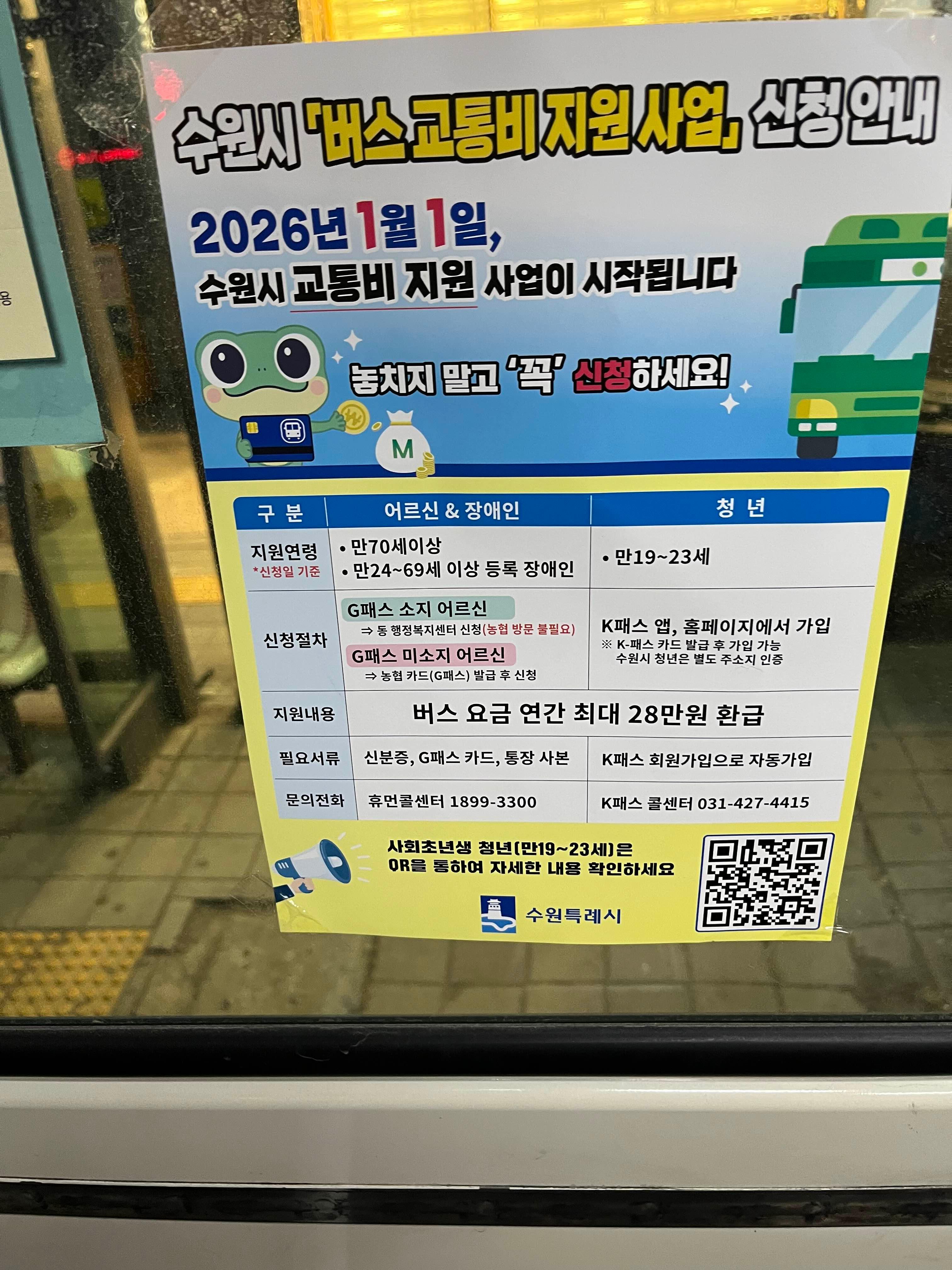 2026년 1월 1일부터 수원시 교통비 지원 사업이 본격적으로 시작됩니다.